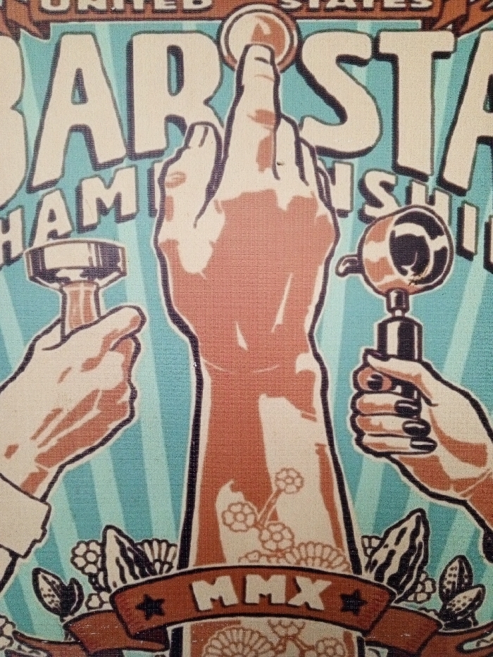 This is an illustration depicting a stylized scene, located in the city of Voa Yeav, Cambodia. The artwork features a large central human arm with light brown skin tones, extending upwards. A tattoo of multiple floral or mushroom-like shapes is visible on the forearm. The hand's index finger is extended, appearing to press or contact a circular, coin-like object above it. To the left, a smaller human hand, wearing a white cuff, holds a metallic coffee tamper. To the right, another smaller human hand, characterized by black fingernail polish, grasps a metallic bottomless portafilter. The background consists of radial stripes in alternating light and dark teal colors. Partial text reading "UNITED STATES BARISTA CHAMPIONSHIP" is visible across the top. At the bottom, a brown banner displays "MMX" (Roman numerals for 2010), flanked by stylized floral and leaf designs.
