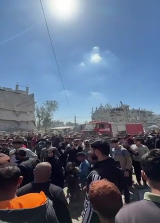 crowd of people gathered in what appears to be a disaster zone. The background reveals buildings in ruins, suggesting a recent event like an earthquake or a bombing. A fire truck is visible amidst the rubble. The weather seems clear, with a bright sun and a blue sky with a few clouds. The crowd consists of men of varying ages, dressed in casual attire. Some are looking around, others are conversing. The overall atmosphere seems somber, given the evident destruction.