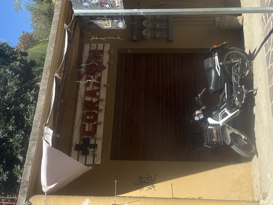 A motorcycle leans against a building next to a closed wooden door. The word "CORAZON" is vertically displayed on a white sign with bare branches and string lights. Electrical meters are positioned above the door. Stickers are visible on a beam above the sign. A torn, white banner hangs off to the side. The wall is yellow and littered with debris. Trees are in the background.
