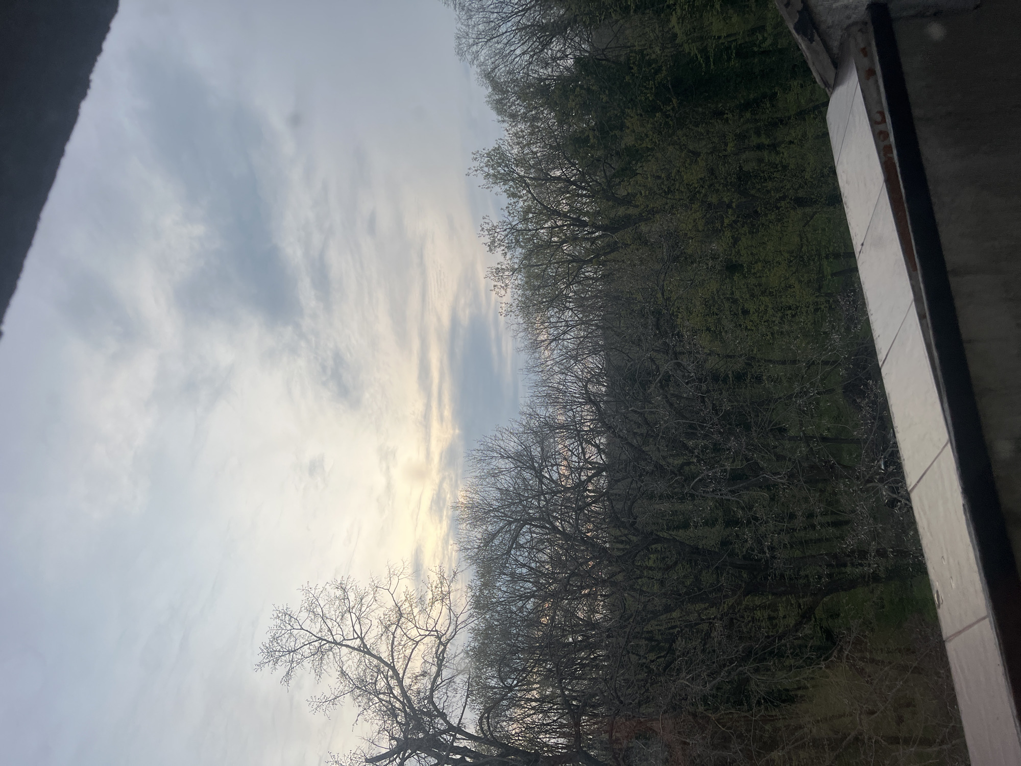 view from a window or balcony in Nikolovo, Bulgaria. The sky is visible, with thin, streaky clouds and areas of bright light, suggesting either sunrise or sunset. Bare trees and trees with budding leaves fill the middle ground, partially obscuring any distant landscape. A concrete and tile structure, likely part of the window or balcony, frames the right side of the view, and another structural element is visible on the top left. No people are visible in the image.