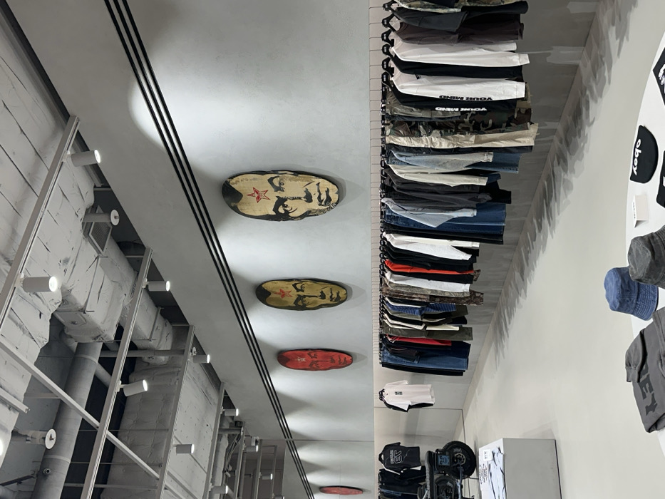The image depicts the interior of the Worksout Suwon Store, located on the 2nd floor of AK Plaza Suwon, Deogyeong-daero 924, Paldal-gu, Suwon-si, Gyeonggi-do, South Korea. The scene is a modern retail space with a distinct industrial aesthetic. The ceiling features exposed ductwork, pipes, and white track lighting fixtures. The walls are a light gray, with two prominent horizontal black stripes running across the upper portion of the main display wall. Adorning this wall are five large, oval-shaped art pieces, each depicting a stylized male face with a red star on the forehead, characteristic of Shepard Fairey's "Obey Giant" artwork. These portraits alternate in color between red and a faded gold/yellow hue. Below the artwork, a long clothing rack extends across the length of the wall, displaying a dense collection of garments. The apparel includes t-shirts, long-sleeved shirts, jeans, and camouflage pants, primarily in neutral colors such as black, white, gray, and various shades of blue and olive green. Garments are hung on black hangers. In the left background, a black motorcycle is positioned on a raised platform, next to a white display block with folded white t-shirts. In the foreground, a white circular display table holds various accessories and folded clothing, including a blue bucket hat, a gray bucket hat, and a black beanie with "obey" text printed in white. No people are present in the image, and no specific actions or interactions are occurring.