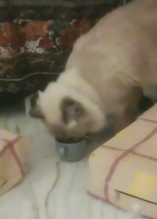 - "A tan and brown cat is drinking from a small, gray bowl on a white and yellow patterned surface" by FM-gHPc12, licensed under CC BY 4.0
