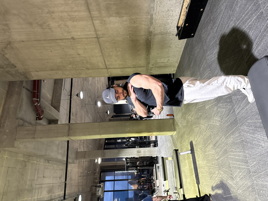 A male individual is pictured flexing his left bicep within an indoor gymnasium