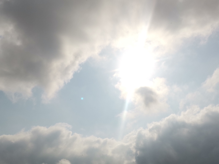 The scene depicts the sky over Owa-Alero, Nigeria. The upper-central portion of the frame is dominated by a bright, intense light source, consistent with the sun, which is partially obscured by clouds, generating a strong lens flare effect and visible light rays. Clouds, varying in shade from white to dark grey, occupy approximately 80% of the visible area, with interspersed patches of lighter blue sky. A distinct blue-green circular lens artifact is present in the mid-left region of the clearer sky. Several minute, dark specks, indicative of distant birds or airborne particles, are scattered across the brighter sky areas. No human subjects, man-made objects, or specific actions are discernible within the frame; the imagery is exclusively of atmospheric conditions.