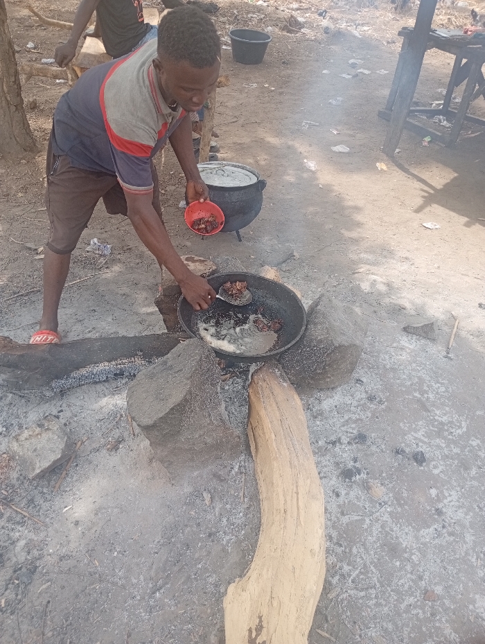 A young man, wearing a red and white striped shirt, is cooking over an open fire in Assai Sabongida, Nigeria