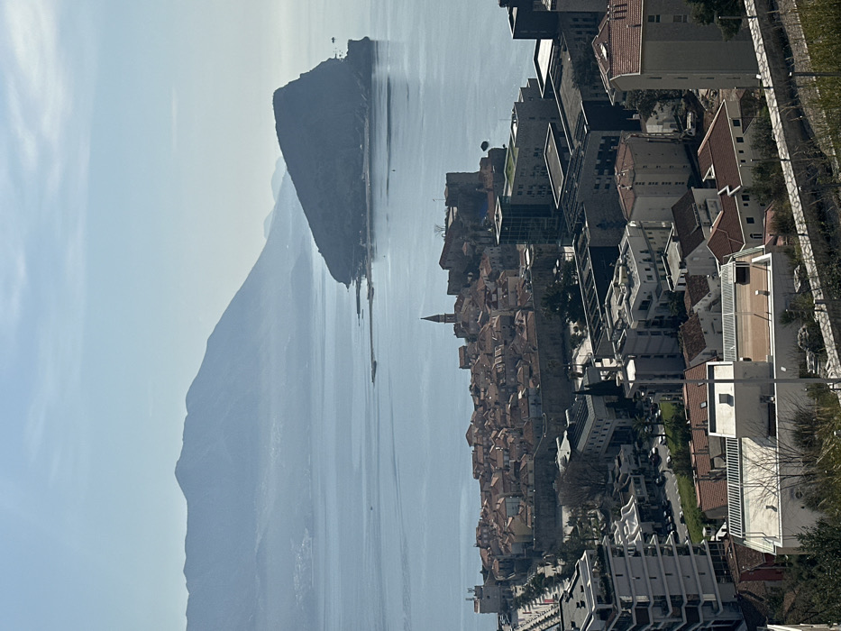 This elevated panoramic image depicts the city of Budva, Montenegro