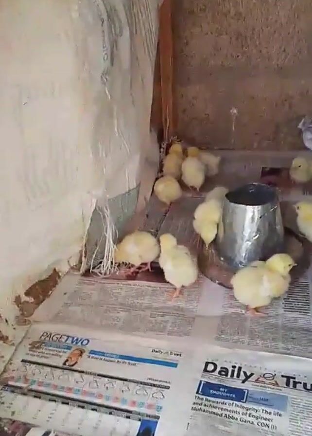 A video shows a group of yellow chicks in a makeshift enclosure lined with newspaper
