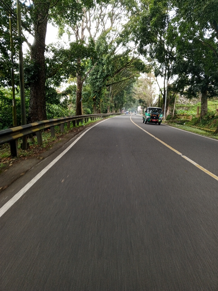 The scene depicts a two-lane asphalt road curving gently to the left, located in the city of Multhan, India. The dark gray road surface exhibits motion blur and features a solid white line marking its left edge and a broken yellow line indicating the center. On the left side of the road, a black and yellow striped metal guardrail runs parallel, backed by dense green foliage and tall trees; a utility pole is partially visible among the trees. On the right side of the road, a green three-wheeled auto-rickshaw or similar utility vehicle is observed traveling away from the viewer, positioned to the right of the broken yellow line. Further down the road, other indistinct vehicles are visible in the distance. The right side of the road is also lined with extensive green trees and a visible stone retaining wall further along. The environment is heavily vegetated, with the trees forming a natural overhead canopy. The lighting is diffuse, consistent with an overcast sky or filtered light.