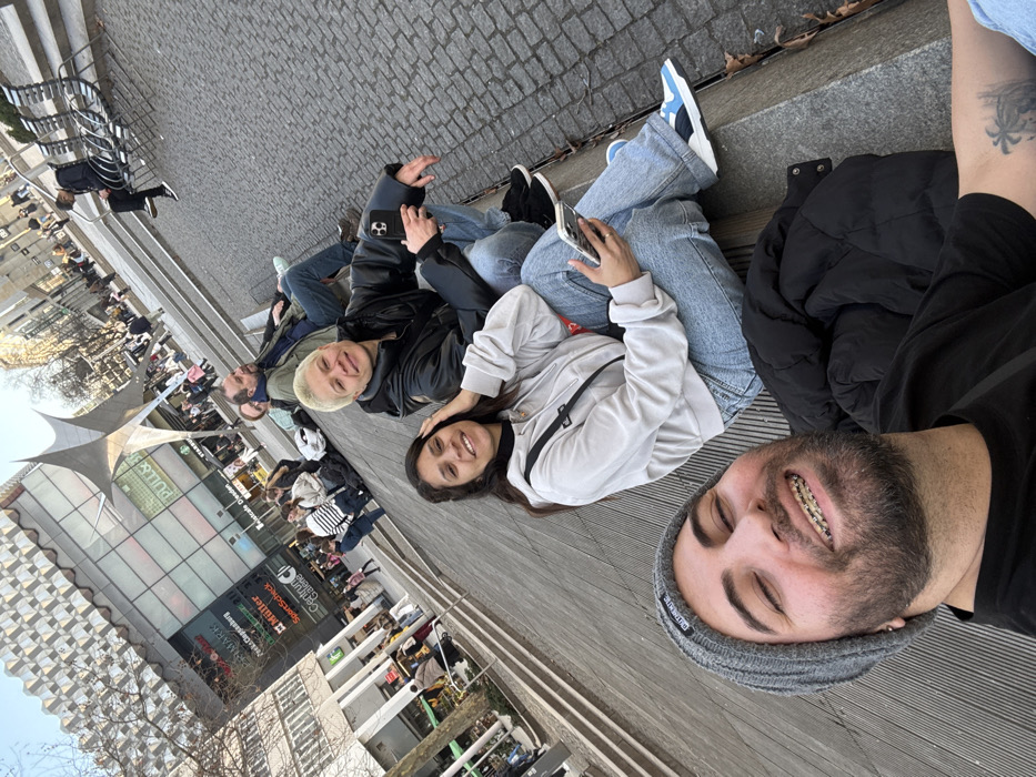 This image depicts an outdoor urban scene at the Centrum Galerie in Dresden, Germany. The foreground features five individuals seated on a slatted wooden surface and adjacent stone steps. Closest to the camera, a male with a dark beard and a grey beanie smiles broadly, revealing dental braces. He wears a black t-shirt, with a black puffer jacket resting beside him. Visible on his left forearm is a tattoo. To his right, a female with long dark hair, wearing a light grey hooded sweatshirt and blue jeans, smiles towards the camera while holding a white smartphone. Next to her, a female with short, bleached blonde hair, dressed in a black puffer jacket and blue jeans, also smiles towards the camera, holding a dark smartphone. Behind these individuals, another male with a beard, wearing a dark jacket and blue jeans, sits on the steps. Further back on the right, a person in dark attire is seated on a metal chair. The background is dominated by the multi-story Centrum Galerie shopping mall facade, displaying store signs for "PRIMARK," "SportScheck," "Müller," "PULL&BEAR," and "Starbucks." A prominent, star-shaped metallic sculpture stands in front of the building. The ground is a mix of cobblestones and paved surfaces. Numerous pedestrians are visible throughout the background, indicating a busy commercial area under a clear blue sky. Bare trees are visible, suggesting a cooler season.