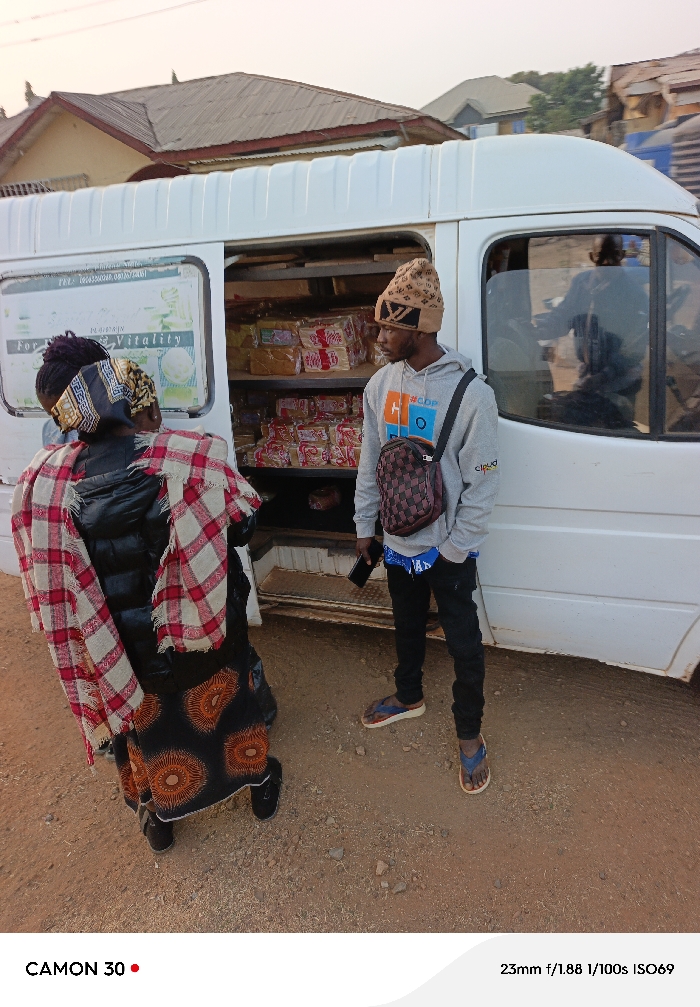 A woman with a patterned scarf and dress stands by a white van, possibly a mobile shop, with the side door open, revealing shelves filled with packaged goods