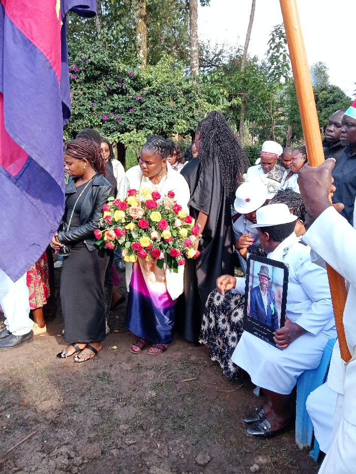 An outdoor scene in Lumakanda ward, Kenya, depicts a gathering of multiple individuals on a reddish-brown dirt ground with sparse grass. On the far left, a large flag with diagonal red and dark blue/purple stripes is partially visible, held by an individual in white pants. To its right, a woman with braided hair, wearing a black leather jacket and a long black dress, stands with downcast eyes. Centrally, a woman in a white top and a multi-colored skirt holds a large arrangement of red and yellow roses. To her immediate right, a woman with long, dark, curly hair in a black garment is partially obscured. Further to the right, a woman in a white uniform is seated on a light blue plastic stool, holding a framed photograph of an elderly man in a suit and fedora-style hat. In the mid-ground and background, additional individuals, including men in dark clothing and women, some with white head coverings, are visible. A wooden pole is partially visible on the far right, held by an individual in white attire. The background consists of dense green foliage, including trees and bushes with some purple flowers. Visible expressions are solemn.