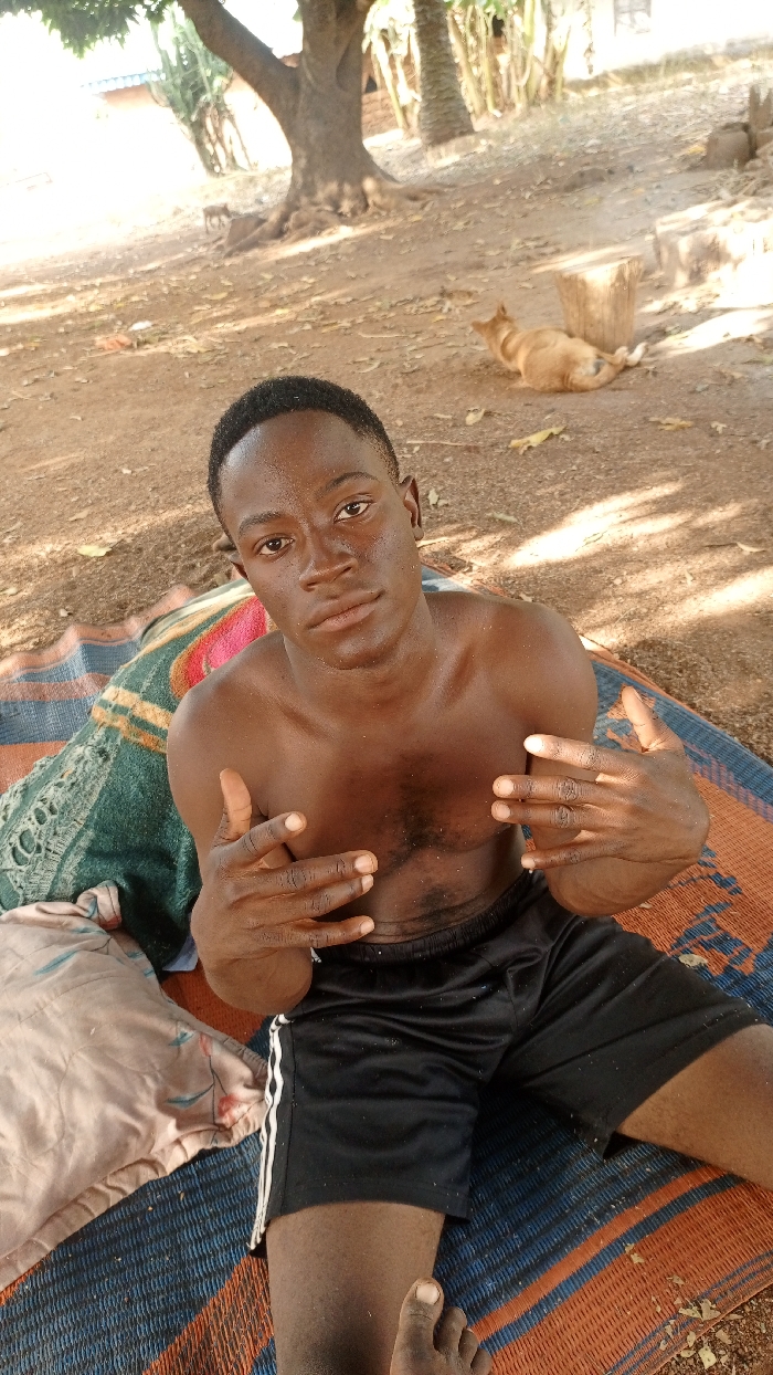 A shirtless Black man wearing black athletic shorts sits on a multicolored woven mat. He faces the camera with a neutral expression, holding his hands up with fingers spread. Behind him, a light brown dog rests near a tree stump in a dirt clearing with scattered vegetation. Another tree stands prominently in the background, providing shade. The setting suggests an outdoor location, possibly a backyard or park.