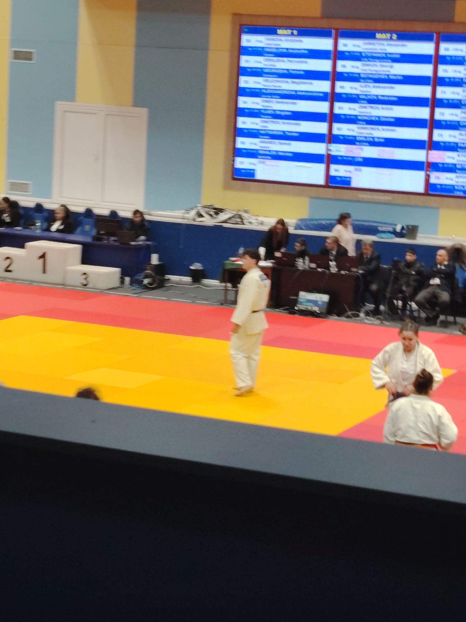 judo competition in Pazardzhik, Bulgaria. Two competitors in white uniforms are on the competition mat, which is a combination of red and yellow. One judoka is standing, while the other appears to be adjusting their belt. In the background, there are officials sitting at tables, some with computers. Behind them, there is a digital board displaying match information. A podium with numbers "2", "1", and "3" is visible to the left. The environment includes a blue and yellow striped wall.