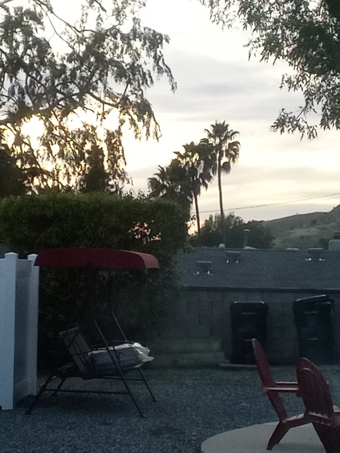 This image depicts an outdoor residential or recreational area, likely at dusk or dawn, within Los Angeles, California, United States of America, specifically a foothill or valley environment. The ground is covered in dark gray gravel or crushed stone. In the left foreground, a dark-framed patio swing with a red arched canopy stands beside a white vertical fence post. A light-colored object, possibly a blanket or cushion, rests on the swing's seat. To the right, a circular, light-colored concrete or stone patio is partially visible, featuring two unoccupied red Adirondack-style chairs. In the midground, a dense, dark green hedge acts as a barrier, partially obscuring a single-story building behind it. This building features dark concrete block walls and a dark-pitched roof with multiple small vents or pipes. Two dark-colored waste bins are positioned against the building's wall. The background reveals a landscape characterized by diverse vegetation and terrain. Several tall palm trees are silhouetted against the bright, partly cloudy sky. The sun's light is visible through the branches of a large, leafy tree in the upper left corner. Undulating, arid hills or mountains are discernible in the distant background. No human subjects are present, and no actions or interactions are depicted.