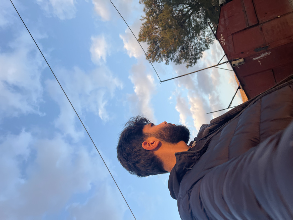 The scene is an outdoor environment in At-Tall, Syria. A male individual, appearing in the foreground, displays his left profile while looking towards the right side of the frame. He has dark, curly hair and a full, dark beard, and wears a black quilted puffer jacket. Warm, directional light illuminates the right side of his face and ear. The upper portion of the image features a bright blue sky with scattered white cumulus clouds. Two taut, dark utility lines traverse horizontally across the upper sky. In the midground to the right, a weathered, reddish-brown structure, resembling a metal shed or container, is visible. Arabic script, identified as "بارات" (Barat), is present on its exterior. Vertical metal poles extend upwards behind this structure, and a tree with green foliage stands further right.