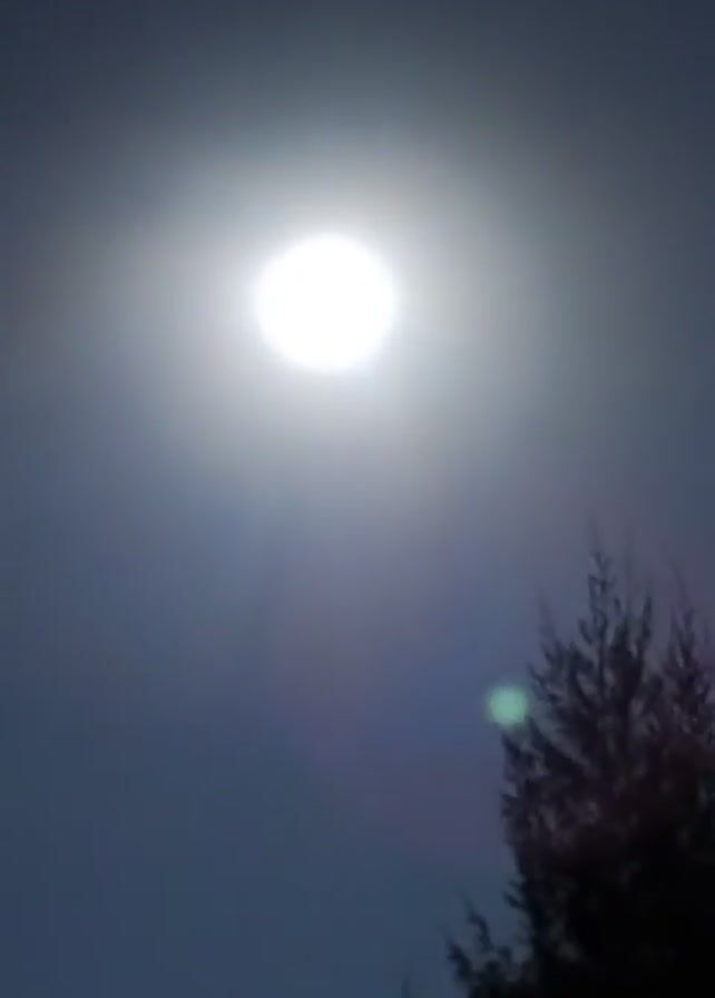 bright sun in a clear blue sky. A tree is visible in the foreground to the right. The camera moves out to show the tree in front of a hill with other trees. To the left of the frame is a building, and below, a gravel path.