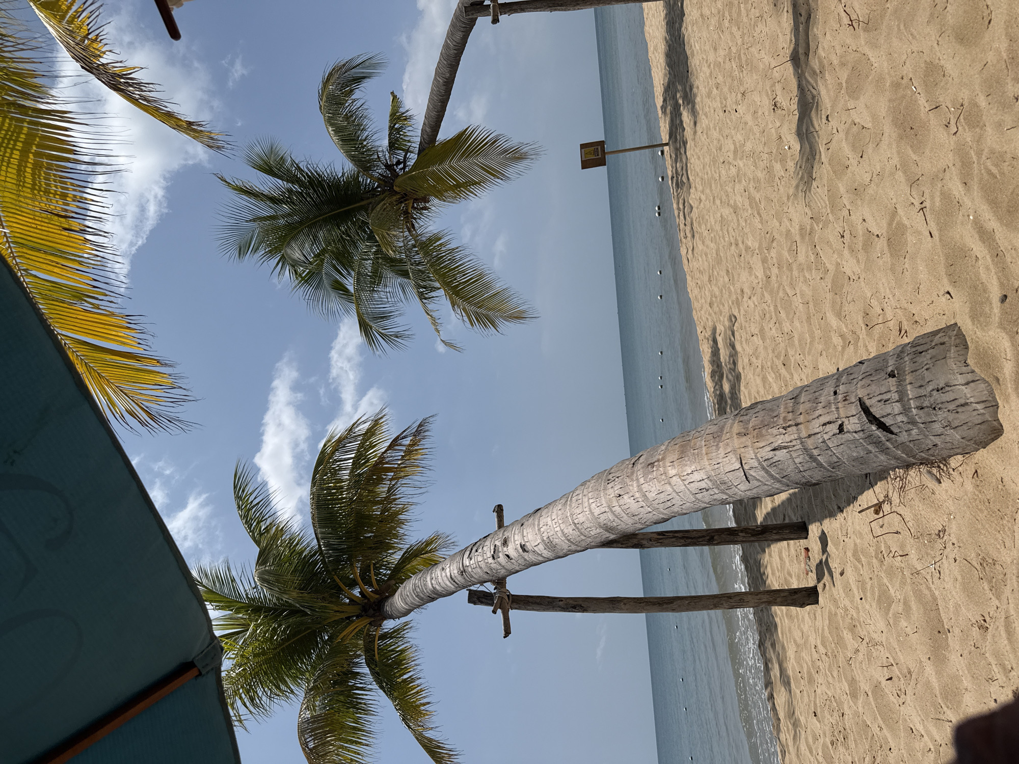 This image depicts a sunny beach scene in Phú Quốc, Vietnam, viewed from beneath a dark teal umbrella. The perspective captures a bright blue sky with scattered white cumulus clouds. Two mature coconut palm trees dominate the midground, both leaning significantly towards the calm, blue-green ocean. The leftmost palm tree features a textured gray trunk supported by two weathered wooden posts, its green fronds extending into the sky. The rightmost palm also leans seaward, supported by a visible wooden post, with its green fronds partially visible. On the light brown sandy beach, near the right palm tree, a brown rectangular sign with a yellow triangular caution symbol is visible. The sandy foreground shows faint undulations and small pieces of debris. A line of white spherical buoys floats in the ocean, marking a boundary. Small waves are breaking gently on the shoreline. No people, animals, or active interactions are visible.