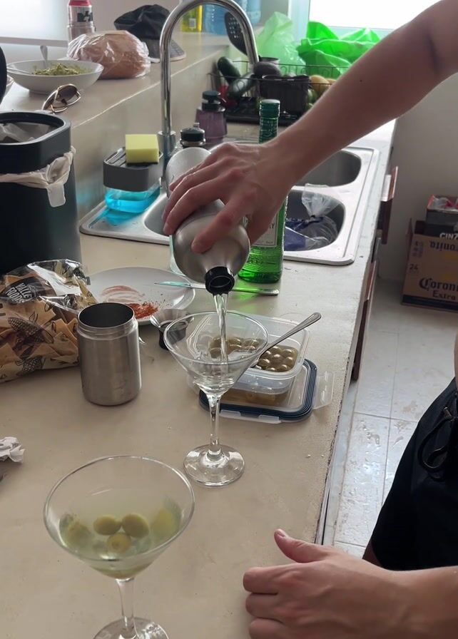 A person pours a drink from a silver cocktail shaker into a martini glass containing olives. The shaker is held above the glass, pouring a clear liquid. Another martini glass, also containing olives, sits nearby. The background features a kitchen counter with a sink, various bottles, food items, and a trash can. The person is wearing a black shirt and shorts, with patterned sandals on their feet. Loud music plays in the background.
