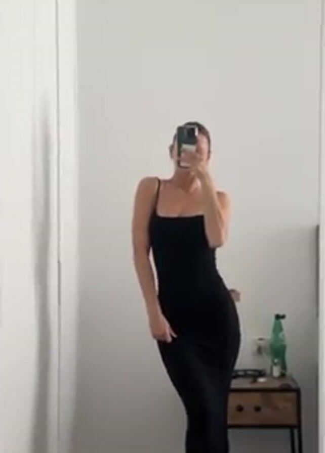 A person stands in front of a mirror in a room. The person is holding a phone and is taking a picture of themselves. The person is wearing a black, tight fitting, spaghetti strap dress. The room has white walls, light colored wooden floors, a closed white closet door and a wooden nightstand. A small green glass bottle and a white electrical outlet are on the nightstand. A lamp is attached to the nightstand. The person moves their arms around as they take pictures of themself.