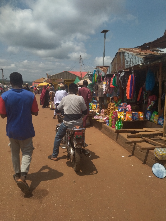 street scene in Lokoja, Nigeria, taken at approximately 7.404 latitude and 7.632 longitude. It is a dusty, dirt road lined with shops and vendors. The shops appear to be made of corrugated metal and wood. The vendor's goods are displayed on makeshift stalls. The scene is bustling with people and activity. Several people are walking along the street, while others are shopping or engaging with the vendors. There is a man riding a motorcycle toward the camera. There is also a streetlamp in the background and a round mirror on the ground in front of the shops. The sky is clear and partly cloudy.