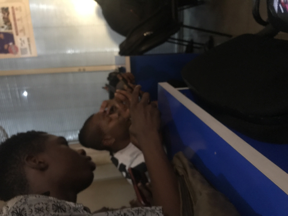 The image depicts an indoor scene within a facility in Calabar, Nigeria, featuring three individuals, predominantly young males, engaged with mobile devices