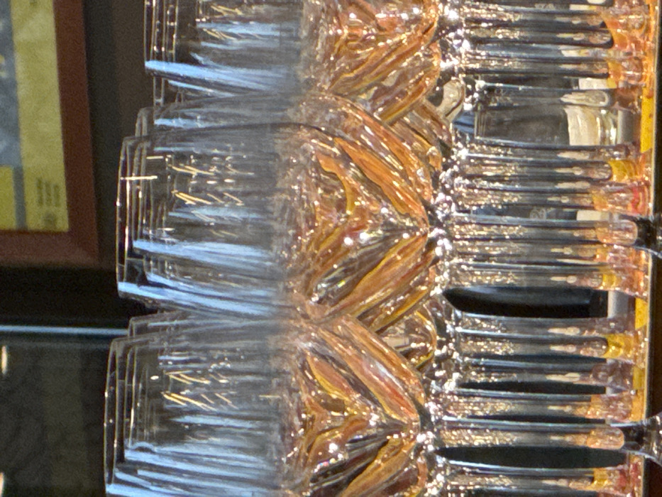 The scene depicts a close-up, eye-level view of multiple clear glass stemmed wine glasses arranged in a linear formation on a flat surface. Each glass features a faceted bowl and a slender stem, exhibiting strong reflections of warm, amber-hued light. The background is out of focus, revealing a dark interior space. A framed object with yellow and brown tones is partially visible in the upper right background. A clear tumbler-style glass is discernible behind the lower portions of the wine glasses on the right. No individuals or overt actions are present in the frame. The location is in Strasbourg, France.