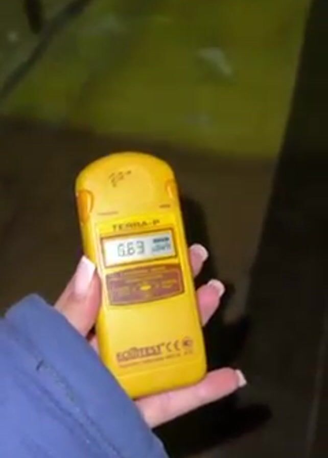The video starts with a close-up of a yellow handheld device displaying a radiation reading that fluctuates slightly between 6