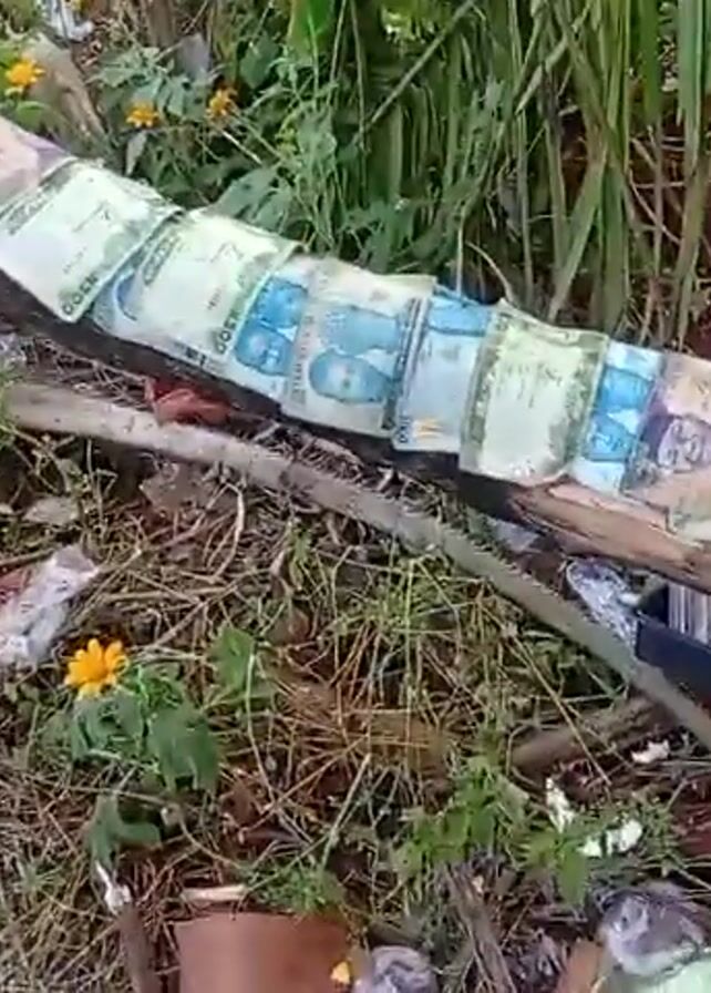 person in an outdoor setting handling Nigerian currency. The person is wearing striped sandals. Various denominations of Naira notes are arranged on a fallen tree branch. The surroundings include grass, fallen leaves, some trash including plastic bottles, and a small orange flower. The person appears to be counting or displaying the money.