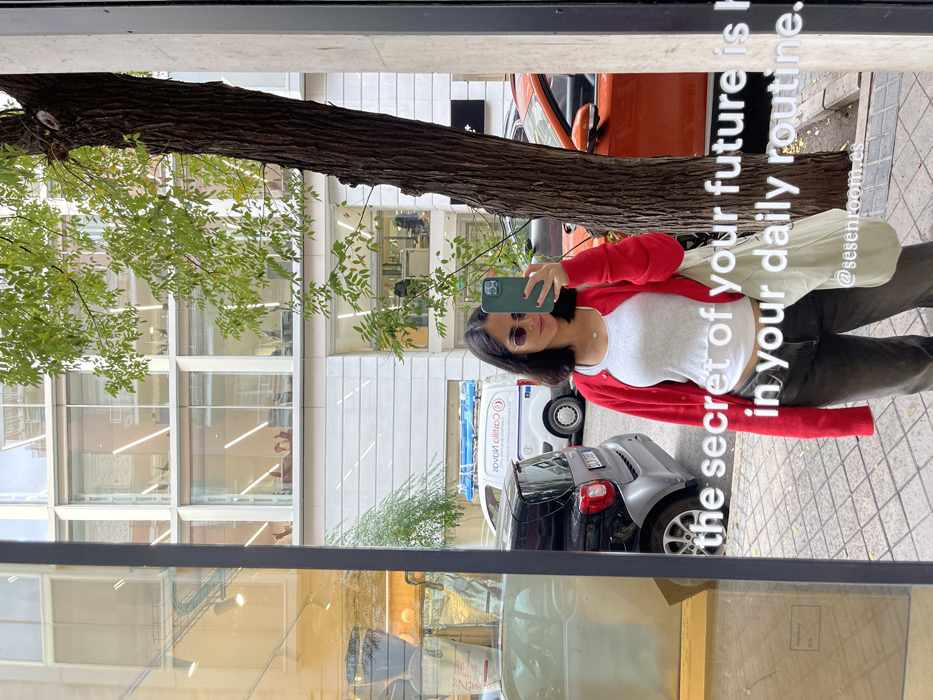 A woman takes a mirror selfie in front of a reflective surface, likely a shop window, on a city street in Madrid, Spain