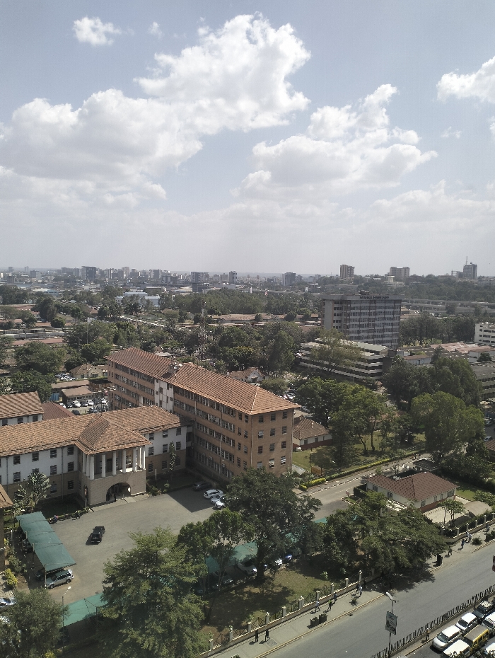 An elevated view shows a cityscape under a partly cloudy sky. Buildings with terracotta roofs contrast with modern high-rises in the distance. Mature trees intersperse the built environment. A large institutional complex with an expansive courtyard and parked vehicles dominates the foreground. A busy road with visible pedestrian traffic and parked cars runs along the lower edge.