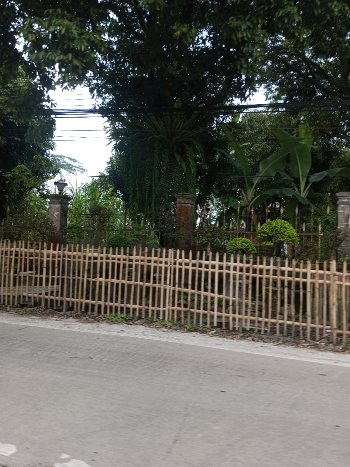The image depicts an outdoor scene in Vieng Phouka, Laos, characterized by dense vegetation bordering a paved road. The foreground shows a light grey paved road with an irregular, lighter-colored margin on its right side. Immediately behind the road is a low fence constructed from vertical and horizontal bamboo poles, appearing light brown and extending across the frame. Behind the bamboo fence, a lush, uncultivated, or semi-cultivated garden area is visible, containing various plant species. Two decorative, weathered concrete or stone pillars are prominent in the middle ground, positioned behind the bamboo fence. The pillar on the left features a dark, urn-shaped finial or decorative light fixture on its top. The pillar on the right appears to be similar in construction but lacks a distinct finial. Between and around these pillars, numerous plants are present, including shrubs, taller grasses, and at least two banana plants with broad green leaves situated towards the right of the central pillar. The upper half of the image is dominated by the dense, dark green foliage of large trees, including one substantial tree in the center-right from which numerous epiphytic ferns, some with long, drooping fronds, are growing. Multiple dark, horizontal utility lines or power lines traverse the scene horizontally across the upper-middle section, appearing to pass through gaps in the tree canopy. The sky, visible in fragmented sections through the foliage, is overcast and bright white. No people or animals are visible, and no actions or interactions are depicted.
