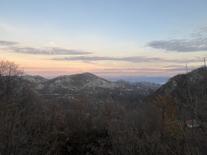 A mountainous landscape with bare trees in the foreground and rocky, speckled peaks in the distance. The sky is a gradient of light blue, pink, and soft orange near the horizon, with thin clouds stretched across. Hints of the Adriatic sea and low-lying mountains peek through the valleys between the peaks. The overall tone is subdued and serene, capturing a quiet mountain vista at dawn or dusk.
