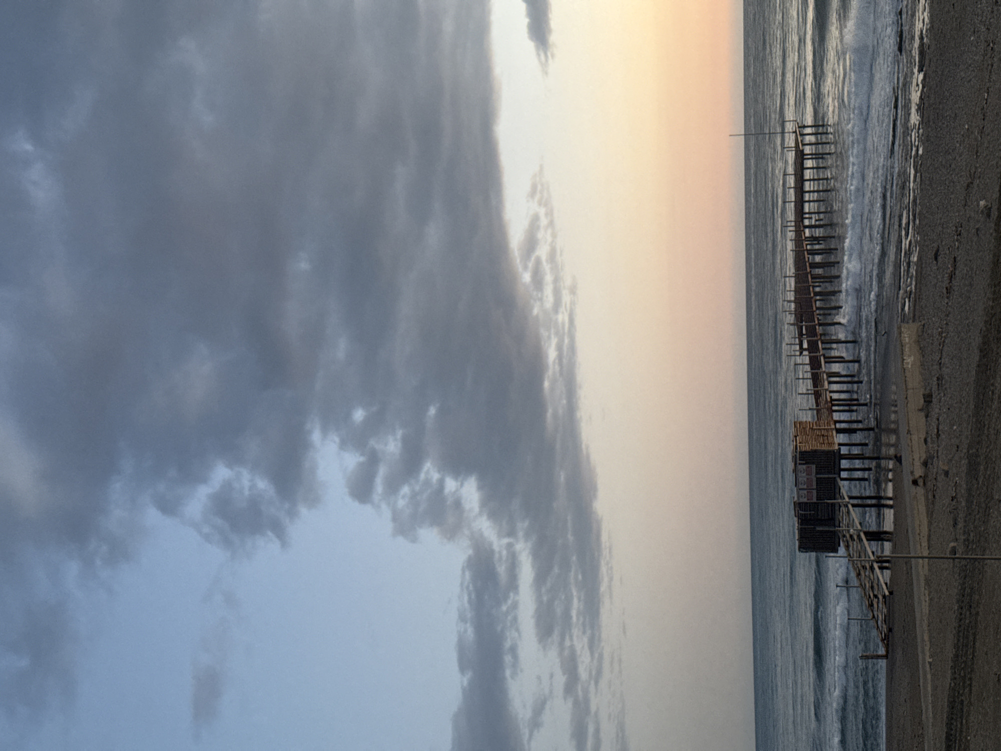 The image depicts a seaside scene in Alanya, Turkey, featuring a pier extending into the water along a shoreline. The sky is overcast with heavy, gray clouds dominating the left side of the frame and a pale orange glow peeking through on the right. The sea exhibits gentle waves lapping against a coarse, dark sand beach. The pier, constructed from metal and wood, runs perpendicular to the beach, with gaps in its structure visible. The overall atmosphere suggests either dusk or dawn on a cloudy day.