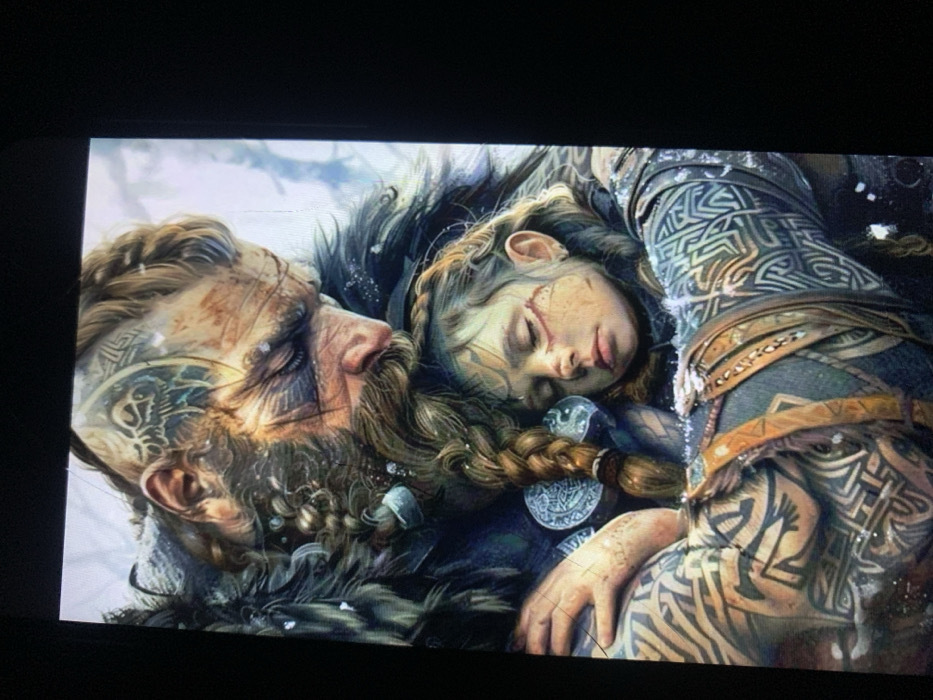 The image is a vertical, stylized digital illustration depicting two figures in a close embrace, set against a blurred, snowy background with visible snowflakes. The primary figure is an adult male, positioned to the upper left. He has prominent reddish-brown hair, partially shaved on the left side, revealing intricate dark tattoos resembling Nordic or Celtic knotwork patterns on his scalp, forehead, and cheeks. He possesses a long, full, braided beard adorned with silver-colored beads or rings. His eyes are closed or looking downwards towards the child. Scars are visible on his left cheek and across his brow. He is wearing heavy, dark, fur-lined clothing and elaborately patterned sleeves on his arms, also adorned with tattoos. His right arm is wrapped around the child, and his left hand rests on the child's arm. The secondary figure is a young child, positioned below and to the right of the male, resting against his chest or shoulder. The child has light brown hair styled in braids and fair skin. Three distinct parallel scars are visible on the child's left cheek, and a smaller mark on the forehead. The child's eyes are closed, suggesting sleep or unconsciousness. The child is dressed in dark, patterned clothing consistent with the male's attire, possibly indicating heavy winter wear or armor. The interaction shows the male holding the child protectively. The overall environment is wintry, characterized by falling snow and a cold atmosphere. This image depicts a fictional, fantasy scene and contains no visual elements or contextual information that identify a real-world location, including any specific area within the city of Jos, Nigeria.