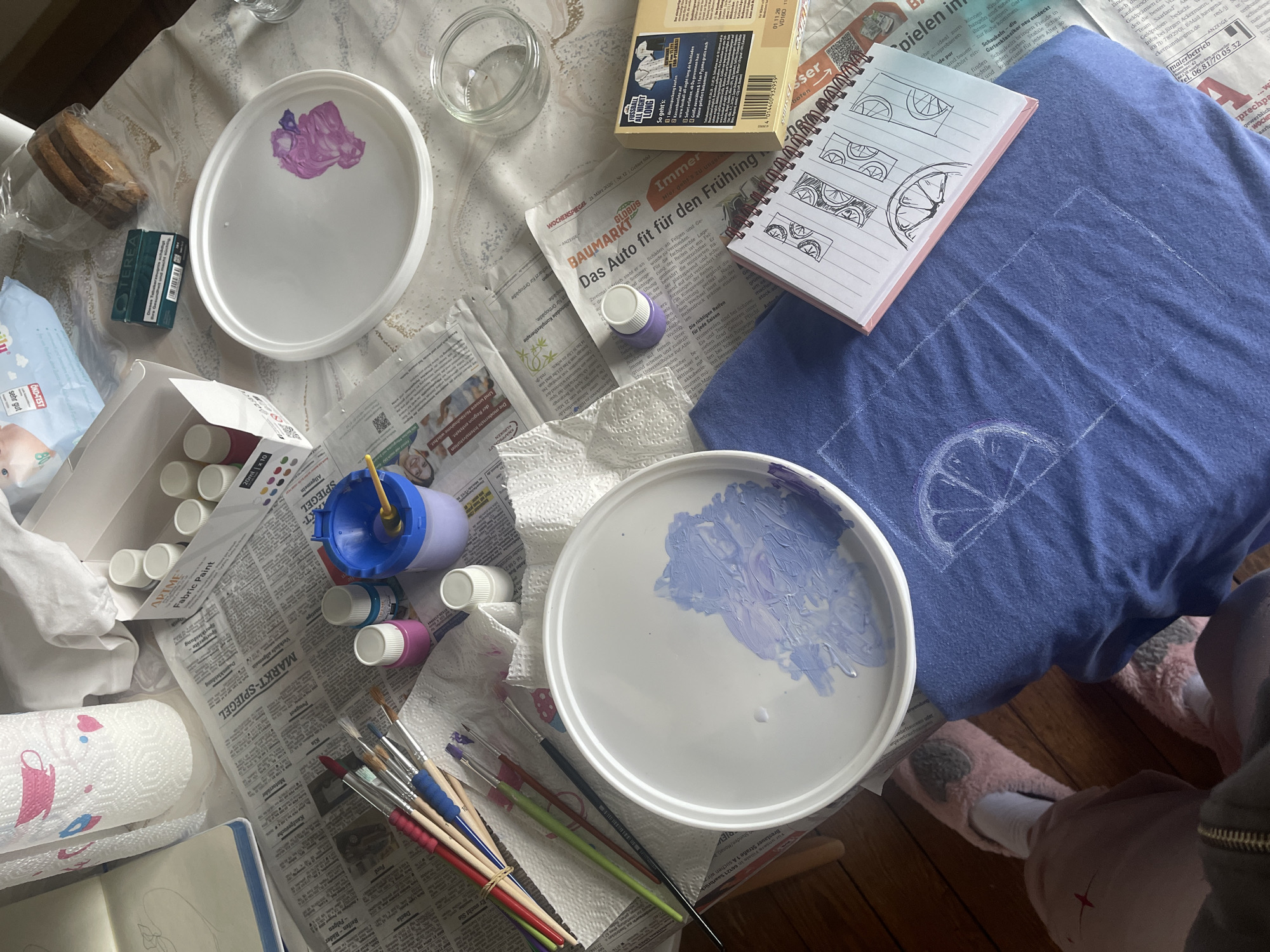 The image depicts an indoor scene, possibly a home or studio, in Saarbrücken, Germany, with art supplies spread out on a table covered with newspaper. At the bottom right of the frame, a person wearing pink bunny slippers is visible, suggesting the photographer is in close proximity to the table. On the table, there are two white plates serving as palettes with purple and blue paint. Tubes of fabric paint, a container with a blue lid and yellow applicator, and assorted paintbrushes are scattered on the newspaper surface. A sketchbook with drawings of fruit slices sits on top of a blue fabric item, which also has a similar fruit design outlined in white. Other items include a box of snacks, a glass jar, a roll of paper towels, and a blue container labeled "TEREA". The newspaper features local advertisements and articles, with visible text indicating the presence of a "Globus Baumarkt" (a hardware store) and references to local businesses and events in Saarbrücken. Overall, the scene suggests an art project is in progress, involving the painting or decorating of fabric with fruit-themed designs.