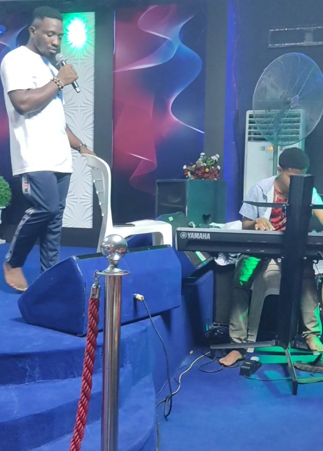 A brightly lit, indoor space features a man singing into a microphone while standing behind a stanchion with a red braided rope. Behind him, a musician plays a Yamaha keyboard. Further back, another person plays a drum set. A woman in a colorful dress is also present, looking at her phone. The room is decorated with a blue carpet, blue padded platforms, a large screen with a wavy design, and several spotlights. The setup suggests a performance or event.