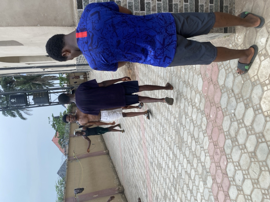 Four shirtless young men are standing in a backyard on a day with a cloudy sky. The backyard has a patterned brick floor and is enclosed by a wall. One man is using a jump rope. One man is wearing white shorts and another is wearing dark shorts. The fourth man is wearing a blue shirt and gray shorts. They are all facing away from the camera.