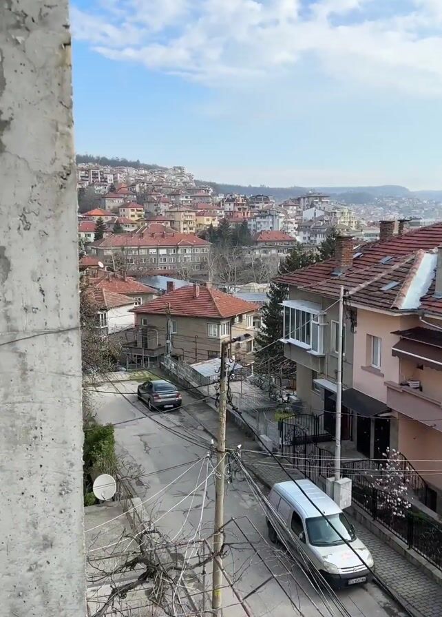 The video starts with a downward view of a residential street with houses and parked cars. There is discarded building material in the foreground. The camera then pans upwards to reveal a cityscape with red-tiled roofs and a forested area in the distance under a blue sky with scattered clouds. As the video continues, the sky becomes increasingly overcast, and the sun is obscured by clouds, resulting in a gray, overcast sky.