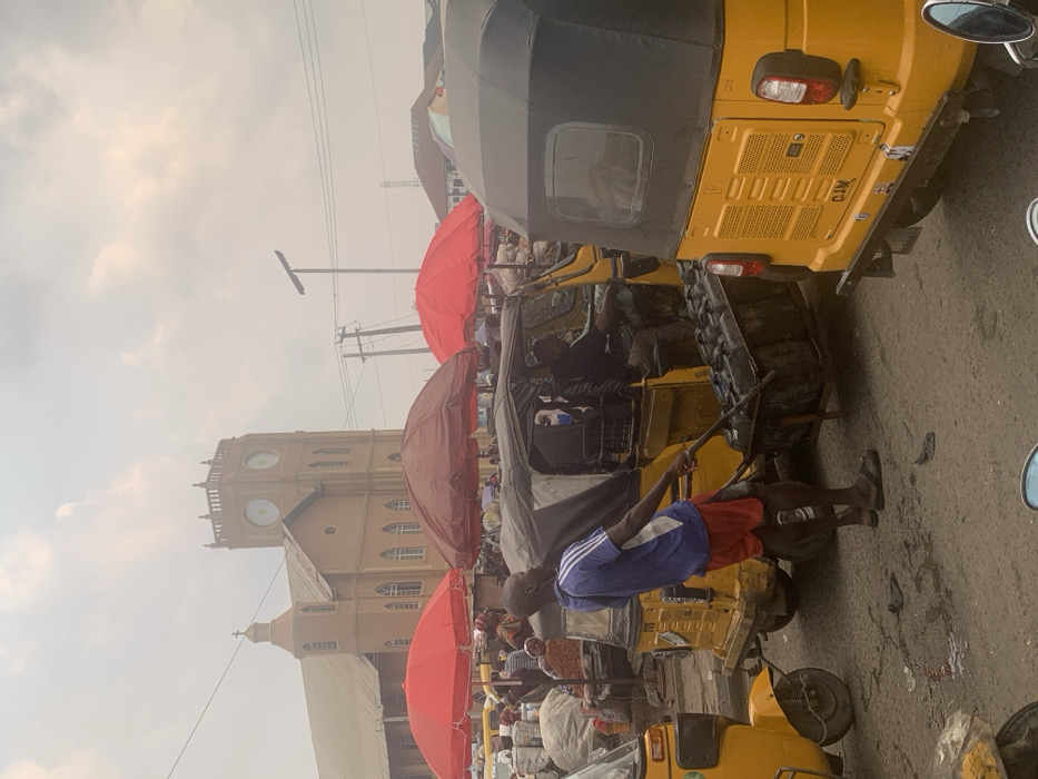 The image depicts a bustling street scene with yellow auto-rickshaws, known as "Keke Napep," prominently featured. A man in a blue shirt is near one, potentially a driver or mechanic. Red umbrellas dot the scene, likely shielding vendors or shoppers. In the background is a large, light-colored building with a clock tower, possibly a church or municipal building. The sky is overcast, creating a somewhat hazy atmosphere.