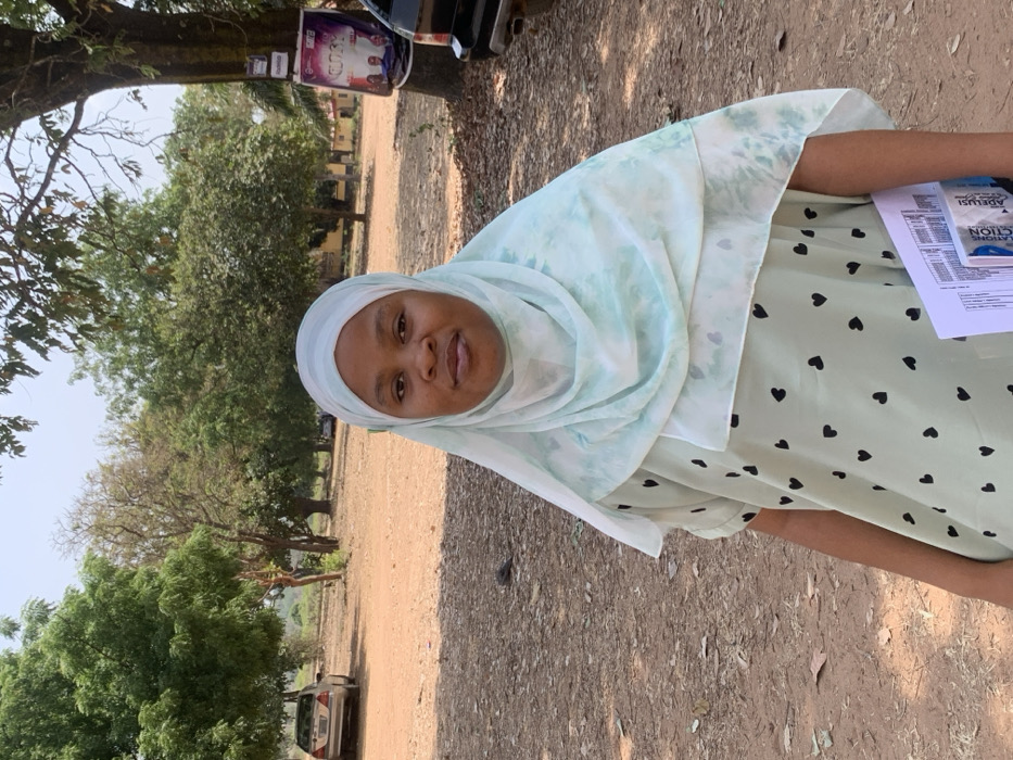 A single woman stands in an unpaved, reddish-brown dirt area in Apata Yakuba, Nigeria, under a bright, clear sky. She is positioned centrally, looking directly at the viewer with a neutral expression. She wears a light green top with black heart patterns and a layered light green and white tie-dye patterned hijab covering her head and neck. In her left hand, she holds a stack of papers or brochures, one of which visibly displays "SELECTION" and "ADELUSI" text. The background consists of numerous green-leafed trees, indicating an outdoor, possibly semi-urban or campus-like environment. To the far left, a light-colored sedan is parked facing right. To the far right, partially obscured by a tree, the rear of a dark SUV or car is visible. A light-colored building with a yellowish tint is partially discernible behind the trees in the mid-ground. Attached to a large tree trunk on the right, several banners are displayed, including a prominent purple and white one featuring faces and text, with "KOLOSA" and "ADELUSI" identifiable. The ground appears dry and dusty, covered with sparse vegetation and fallen leaves in some areas.