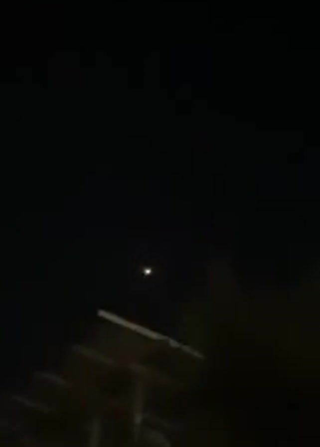 The video appears to be recorded at night, as the scene is mostly dark. There are a few objects visible in the lower part of the frame, including what seems to be a building roofline and trees. A bright flash of light, possibly from an explosion, is seen in the sky, accompanied by a loud noise.