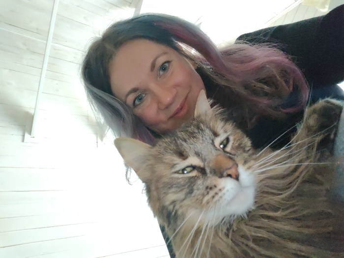 The image depicts an indoor scene in Свистуха (Кузяевский С/О), Russia. An adult female, positioned in the upper left, displays a faint smile with blue eyes and multi-toned hair featuring grey/silver and pink/purple highlights over dark roots. She wears a dark top. She is holding a large, long-haired tabby cat, likely a Maine Coon, positioned prominently in the lower right. The cat exhibits brown, grey, and black striped fur, a white muzzle with long white whiskers, and appears relaxed with partially closed eyes. One of the cat's forepaws is visible, resting against the woman's person. The background consists of brightly lit white horizontally paneled walls and a matching ceiling, with a white structural element visible in the upper left corner. The perspective is a close-up, suggesting a selfie, taken from a slightly low angle.