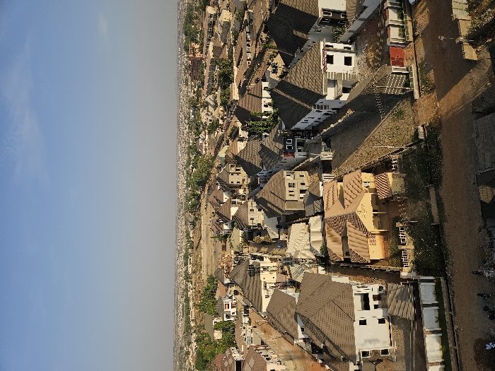 An aerial view reveals a densely packed residential neighborhood with rows of houses stretching into the horizon under a blue sky. The buildings, primarily white and brown, exhibit uniform roof designs and close spacing. A dusty road runs alongside the houses, highlighting the urban density. Distant haze obscures the cityscape farther out.