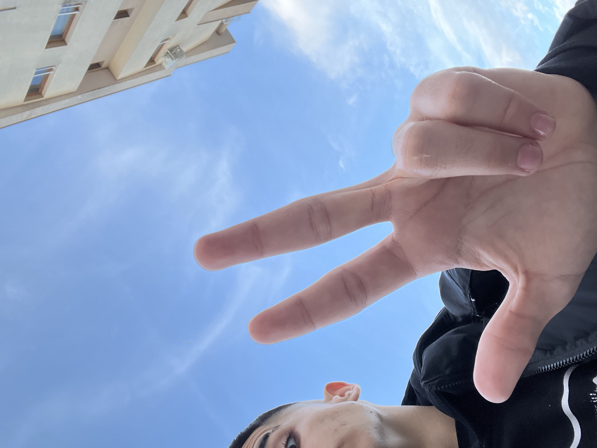- "A low-angle, upward-facing photograph shows a person with their right hand raised, forming a "V" or peace sign with their index and middle fingers" by FM-1lPCD2, licensed under CC BY 4.0