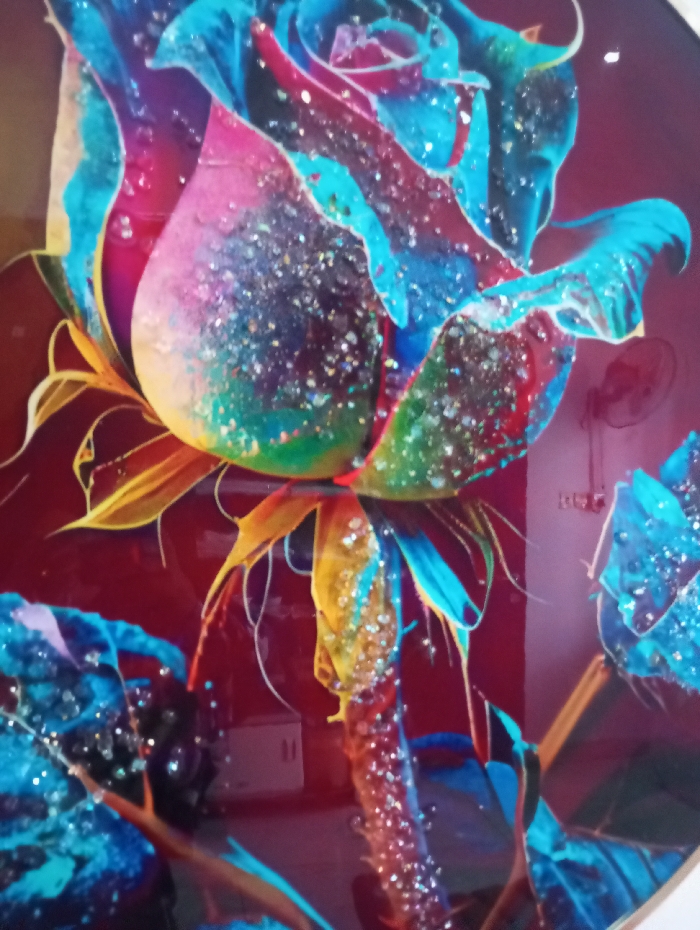 The image depicts a close-up of a vibrant, multi-colored rose artwork displayed on a glossy, reflective surface, likely glass or resin