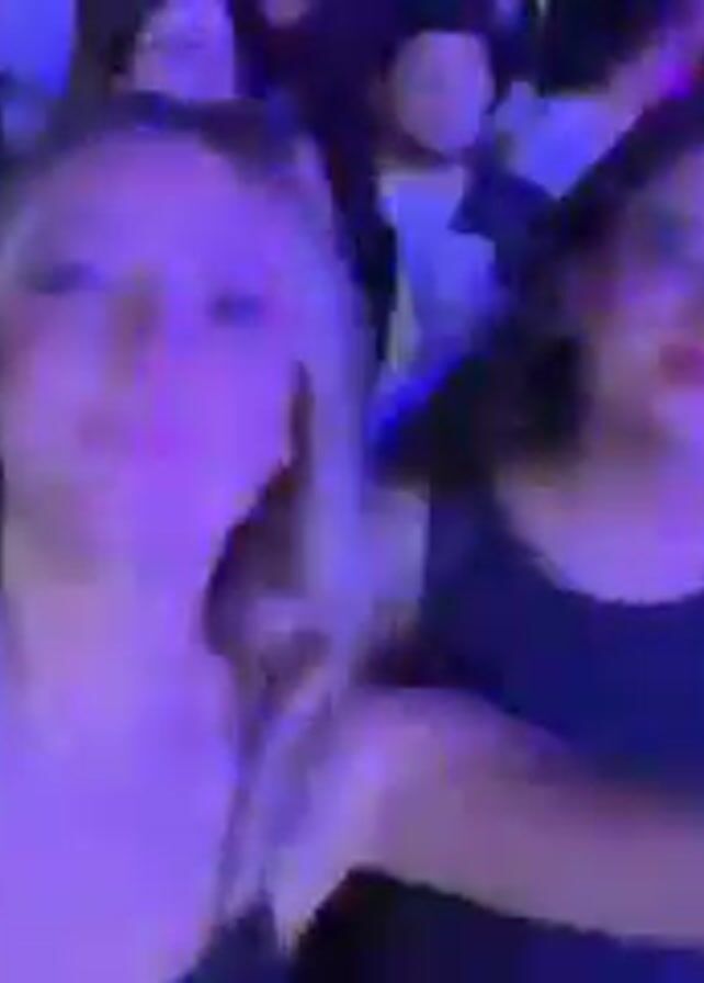 Two young women are taking a selfie at a crowded event, possibly a concert or party. The woman in the foreground has blonde hair and is wearing a black tank top. The other woman has dark hair and is also wearing a black tank top. They are both looking at the camera and dancing slightly. The background is filled with people, mostly blurred, and the lighting is colorful and dynamic. The mood seems energetic and fun.