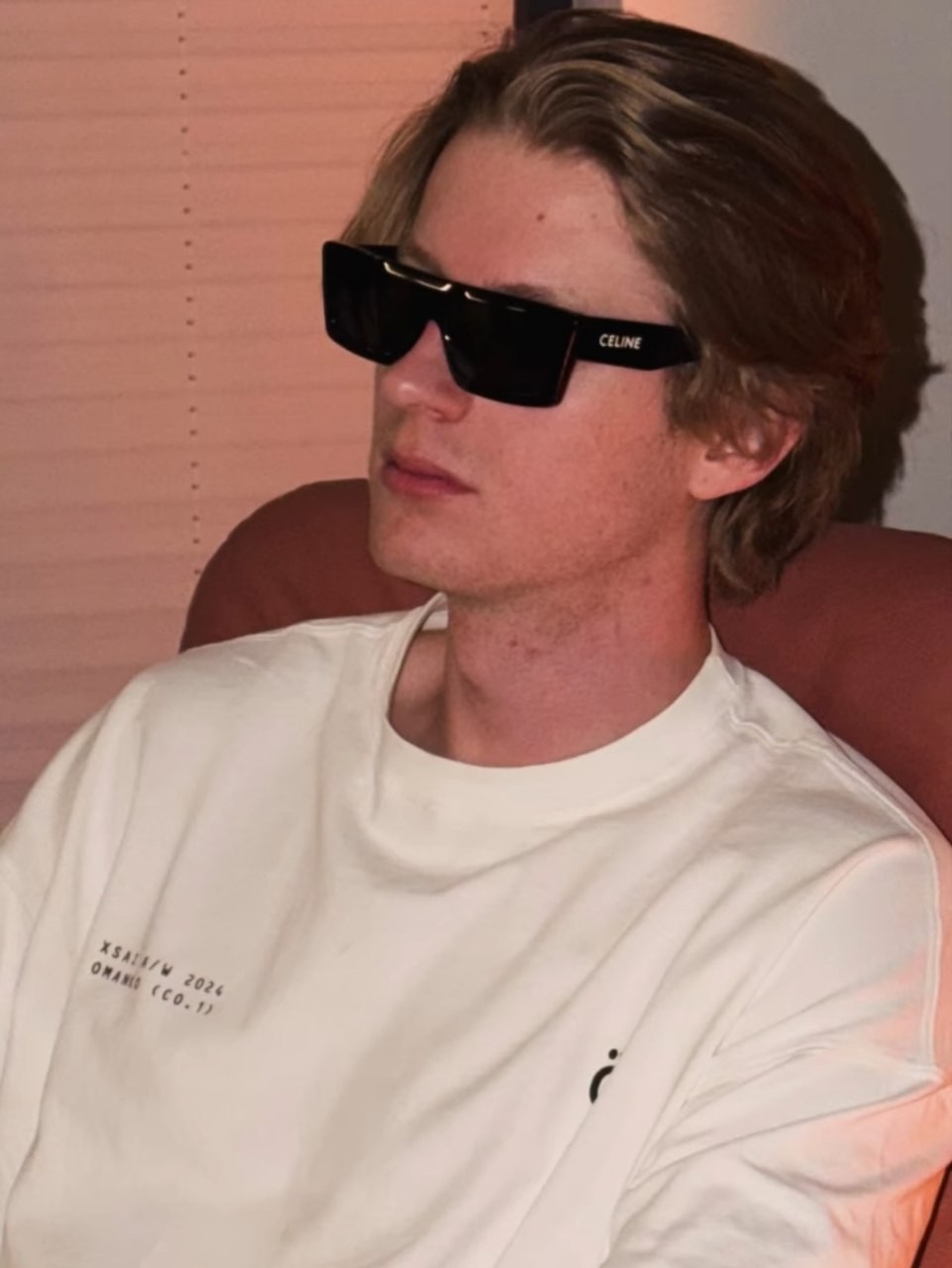An individual, appearing male, with light brown hair, is depicted in a close-up indoor portrait. The subject wears oversized, rectangular black sunglasses prominently displaying "CELINE" in white text on the right temple. They are dressed in a plain, off-white short-sleeved t-shirt featuring black text on the upper left chest area that reads "XS A/I W 2024" and "OMANIS (CO.1)", with an additional small black graphic resembling an inverted question mark positioned towards the right of the collar. The individual's head is turned slightly to their left, with eyes obscured by the sunglasses and a neutral facial expression. The background on the left consists of a light-colored, horizontally textured surface, possibly blinds or wall paneling. To the right and behind the subject, a dark reddish-brown object, likely furniture or a cushion, is partially visible. The scene is illuminated by warm, artificial lighting, casting an orange hue on the environment. The image contains no identifiable landmarks or features to determine a specific location within Sofia, Bulgaria.