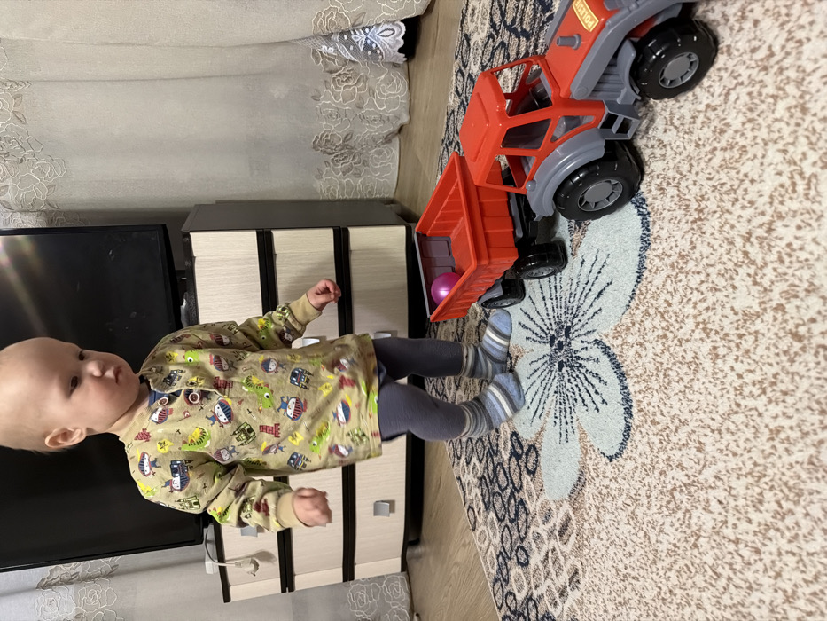 An indoor scene in Alnashi, Russia, shows a young child standing on a patterned rug. The child, a toddler with fair skin and light hair, is wearing a light brown long-sleeved shirt with colorful cartoon patterns, dark grey leggings, and light blue striped socks. The child faces slightly right, looking down towards a red and grey plastic toy tractor with "POLESIE" marked on its side, connected to a red plastic trailer containing a small pink ball. Behind the child and to the left is a light wood-grain dresser with dark edges and silver handles, topped by a dark-screened television. To the right, light-colored curtains with an embroidered floral pattern are visible. The rug has a light brown background with dark geometric and light blue floral designs.
