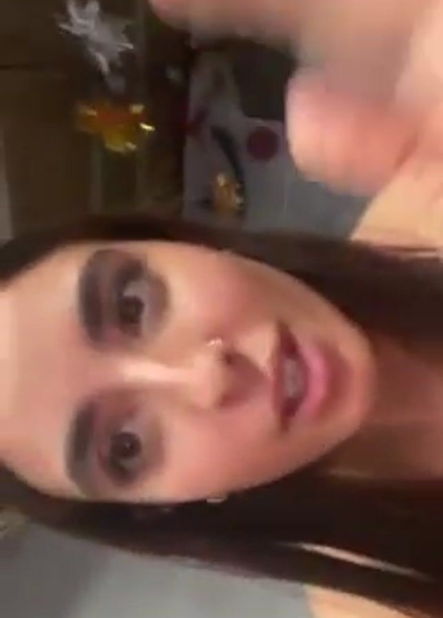 A young woman is holding a camera close to her face and tilting it slightly. She has long, dark hair and a nose piercing. She is touching her cheek with her hand and looking at the camera. The background is blurry, but it appears to be an indoor space with some light fixtures visible.