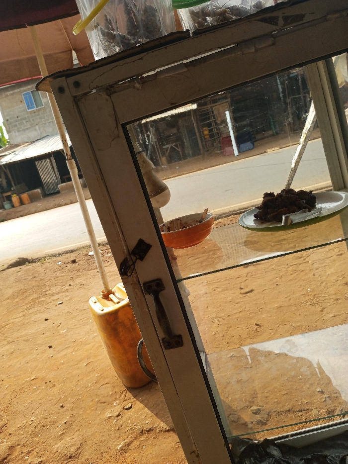 A weathered white-framed glass display case stands outdoors on a reddish-brown ground. Inside, a bowl of food sits on a shelf. Beside it, a white plate holds dark, fried morsels with a fork. The scene outside the case shows a street with buildings, capturing a sunny day. The base of the display case includes a yellow jerrycan and what appears to be a supporting pole, covered by a sun shade.